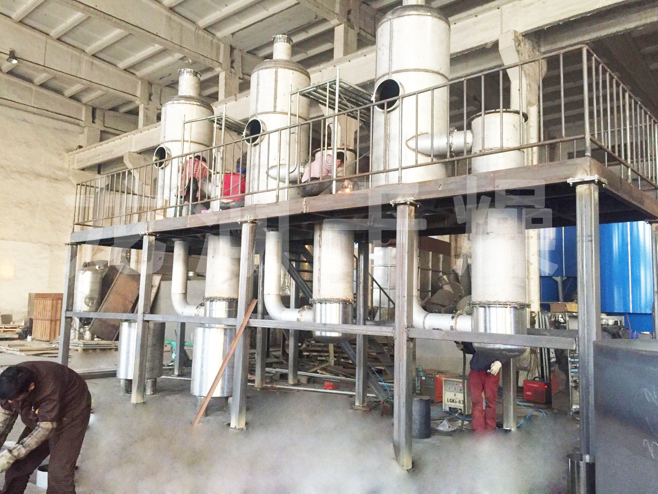 單效或多效降膜蒸發器,適用于牛奶、葡萄糖、淀粉、木糖、制藥、化工、生物工程、環保工程、廢液回收等行業進行低溫連續式蒸發濃縮,具有傳熱效率高,物料受熱時間短等主要特點,所以特別適用于熱敏性、粘滯性、發泡性等物料。